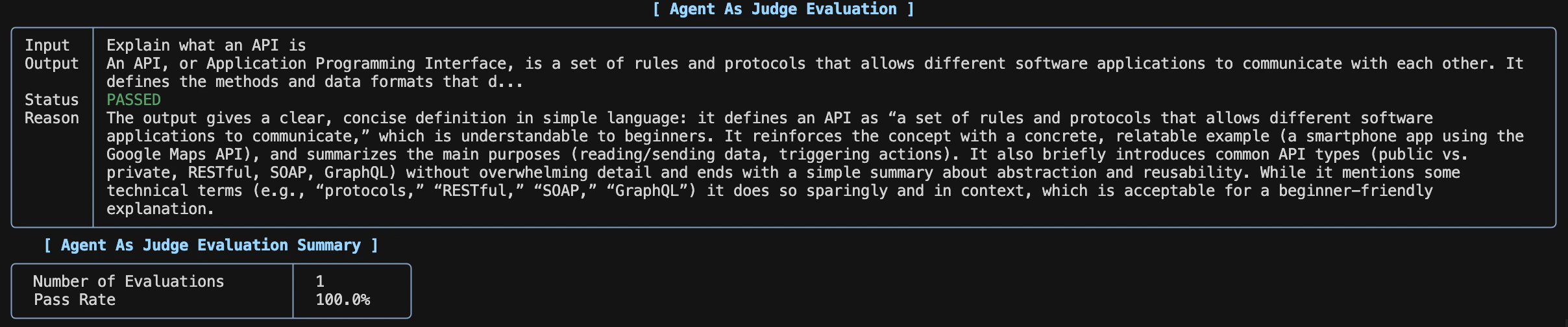 In this example, the AgentAsJudgeEval will evaluate the output of the Agent with their input, providing a score of the Agent’s response according to the custom criteria provided.